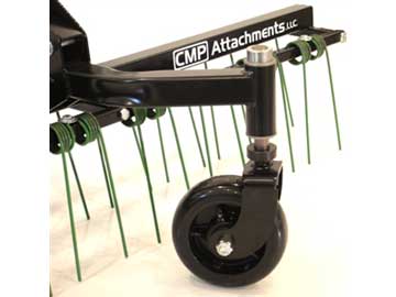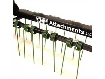 CMP Attachments CMP-ZLT zero-turn mower front mount dethatcher is designed especially for commercial and residential use. The tires and tines are made in the USA so you know you are buying quality product which will save you money and time. No more replacing tines every year because these tines are industrial agricultural tines. This CMP Z-Turn front mount dethatcher is built with 1/8" steel and 14GA main frame tubing. This front mount mower dethatcher rake is great for use in dethatching grass to let your lawn breath. Healthy grass needs air and room to grow. CMP dethatchers allow you to quickly and easily remove any build-up of dead grass, leaves, stems and over crowded roots promoting a lush, green lawn. No longer is your zero turn mower confined to using a pull behind dethatcher designed for a lawn tractor or ATV. With this CMP Attachments front mount dethatcher you aren't required to take wide turns to avoid damaging the hitch and toung of a pull behind dethatcher. This Zero-Turn dethatcher turns with your mower. Mounting in front of the mower allows the extracted thatch to be mulched by the mower blades, for faster decomposition, or collected using a sweeper.